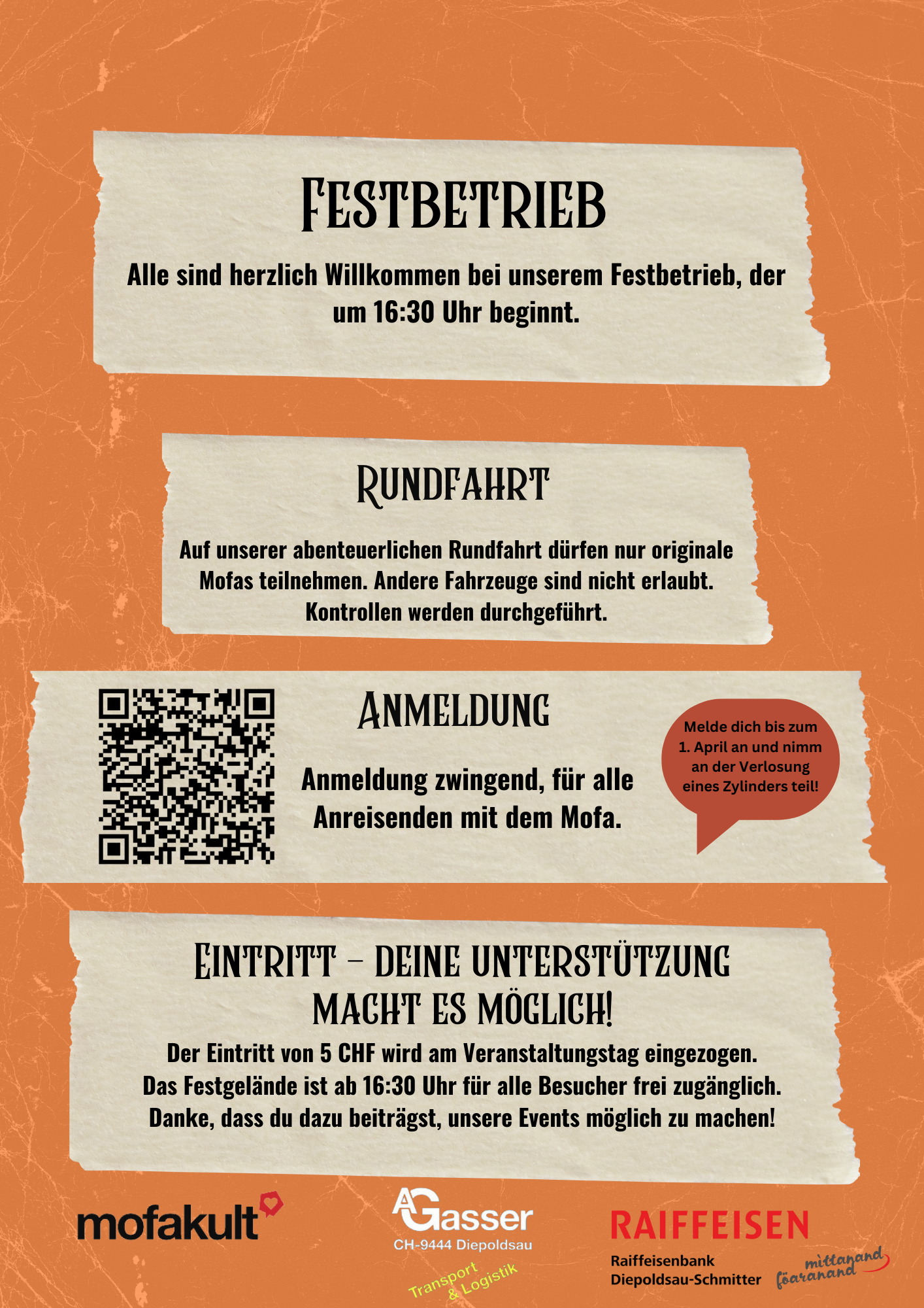 Wir sind eine leidenschaftliche Gemeinschaft von Mofa Enthusiasten, die ihre Liebe zu den Mofas mit Gleichgesinnten teilt. Seit unserem ersten Treffen im Jahr 2021 veranstalten wir jährlich eine grosse Veranstaltung mit Ausfahrt, bei dem wir zusammen unvergessliche Momente erleben. Was als kleines Treffen begann, hat sich mittlerweile zu einer starken Gemeinschaft mit über 100 Mitgliedern aus der Schweiz, Liechtenstein, Österreich und Deutschland entwickelt.